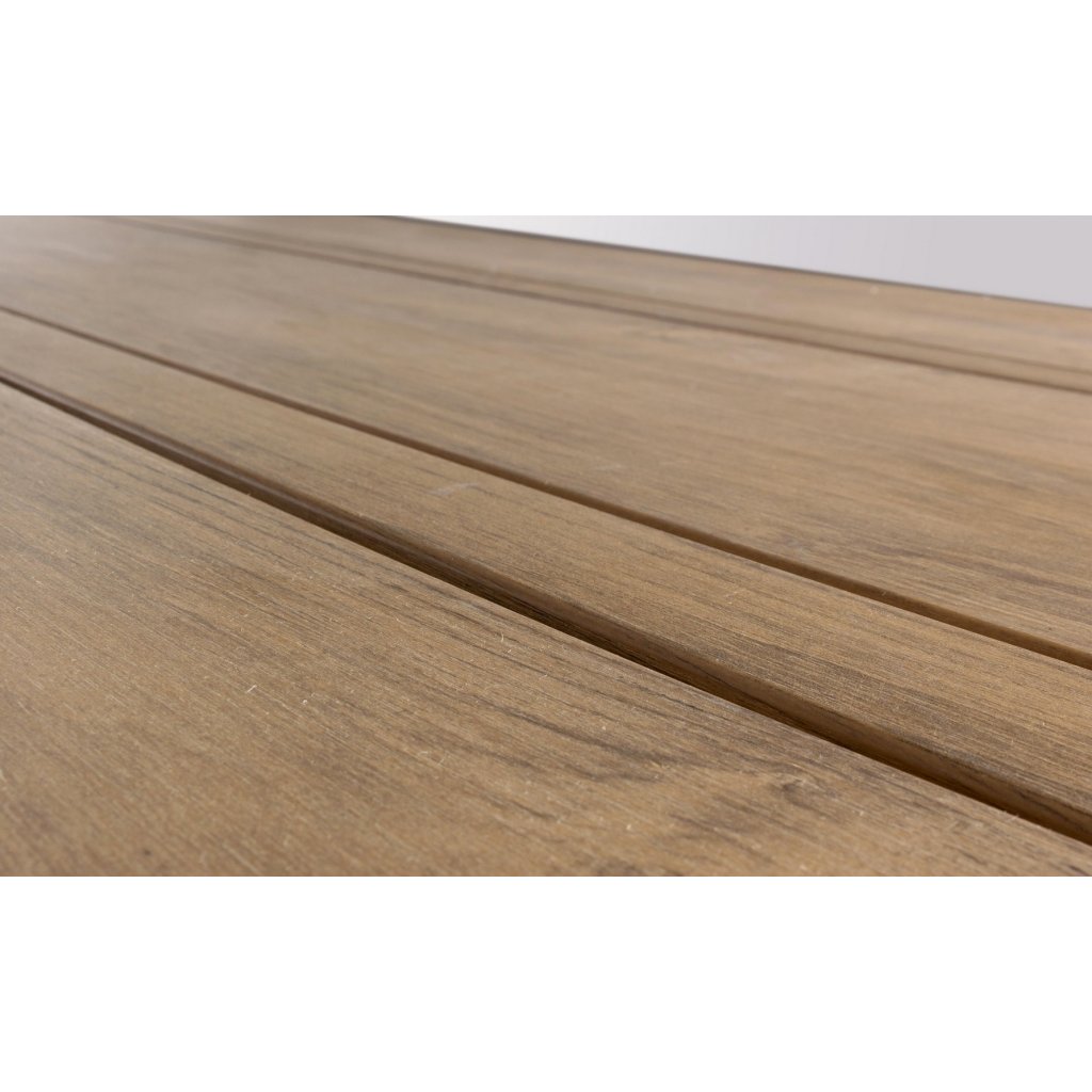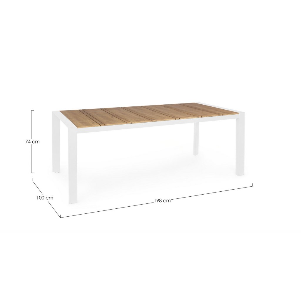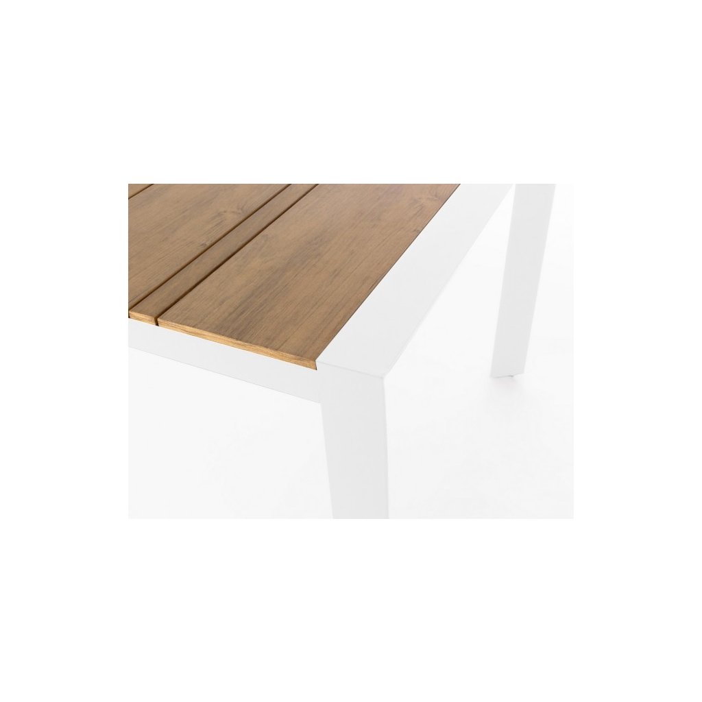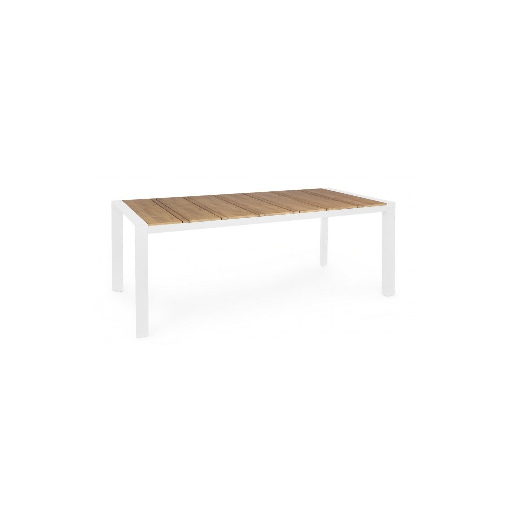 Zahradní stůl ELIAS od italského výrobce stylového nábytku BIZZOTTO. Stůl má 4 masivní nohy, které jsou vyrobeny z bíle lakovaného hliníku, což dodává stolu stabilitu, odolnost proti povětrnostním podmínkám a nízkou váhu. Vrchní deska má primární rozměry 198x100 cm a je tvořena z jednotlivých desek umělého dřeva POLYWOOD v barvě indického teaku. Díky tomu stůl můžete nechat téměř bez jakékoliv péče a obavy.