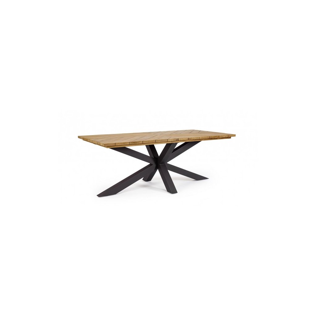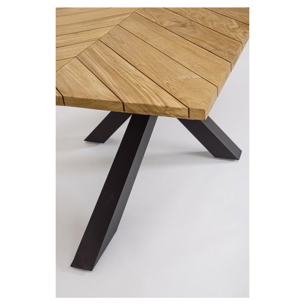 Unikátní jídelní stůl PALMDALE od italského výrobce stylového nábytku BIZZOTTO. Zahradní stůl PALMDALE má nohy ve tvaru masivního "ježka" dodávané z hliníku v černé barvě, díky čemuž je stůl odlehčený a zároveň pevný a stabilní. Vrchní deska má krásný obdélníkový tvar s rozměry 200x100cm, je složen z jednotlivých prken exotického teaku v kvalitě A. Díky délce 200cm se ke stolu vejde minimálně 6 až 8 osob.