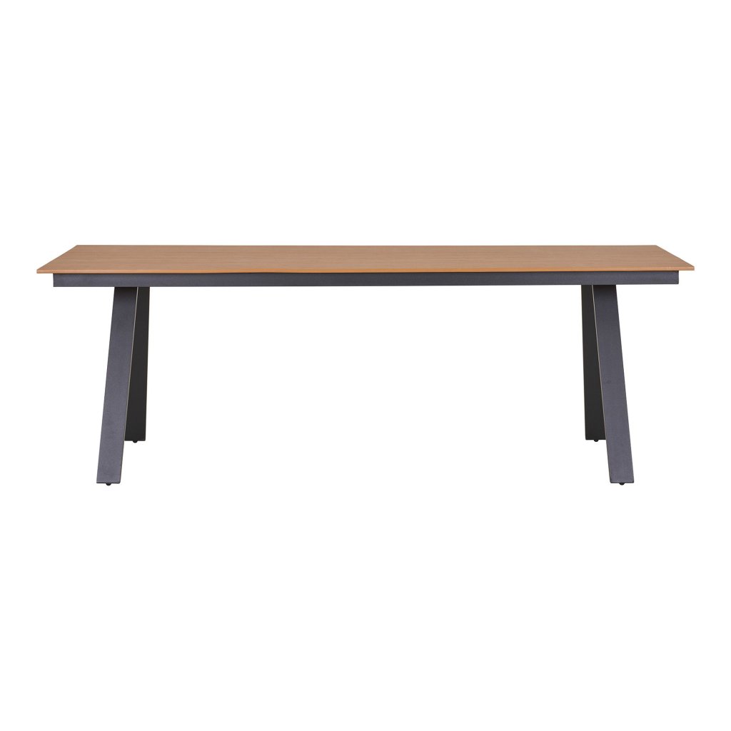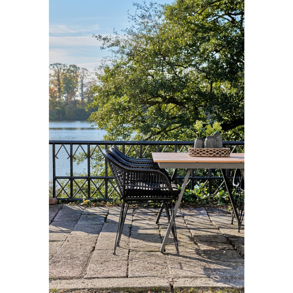 Designový zahradní stůl TORONTO od dánské značky nádherného skandinávského nábytku HOUSE NORDIC. TORONTO je velmi krásný a stylový zahradní jídelní stůl s 4 nohami z lehkého hliníku v černé barvě. Vrchní jídelní deska s rozměry 220x100 cm je složena ze 3 prken, s viditelnými dělícími mezerami, které jsou vyrobeny z odolného plastu imitující dřevo v hnědém provedení. Díky tomu je stůl velmi odolný a téměř bezúdržbový.