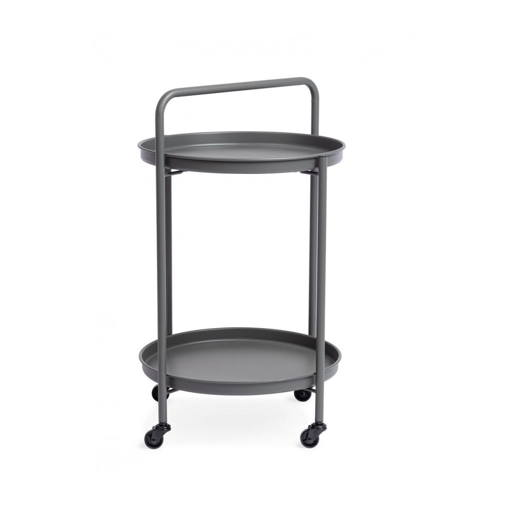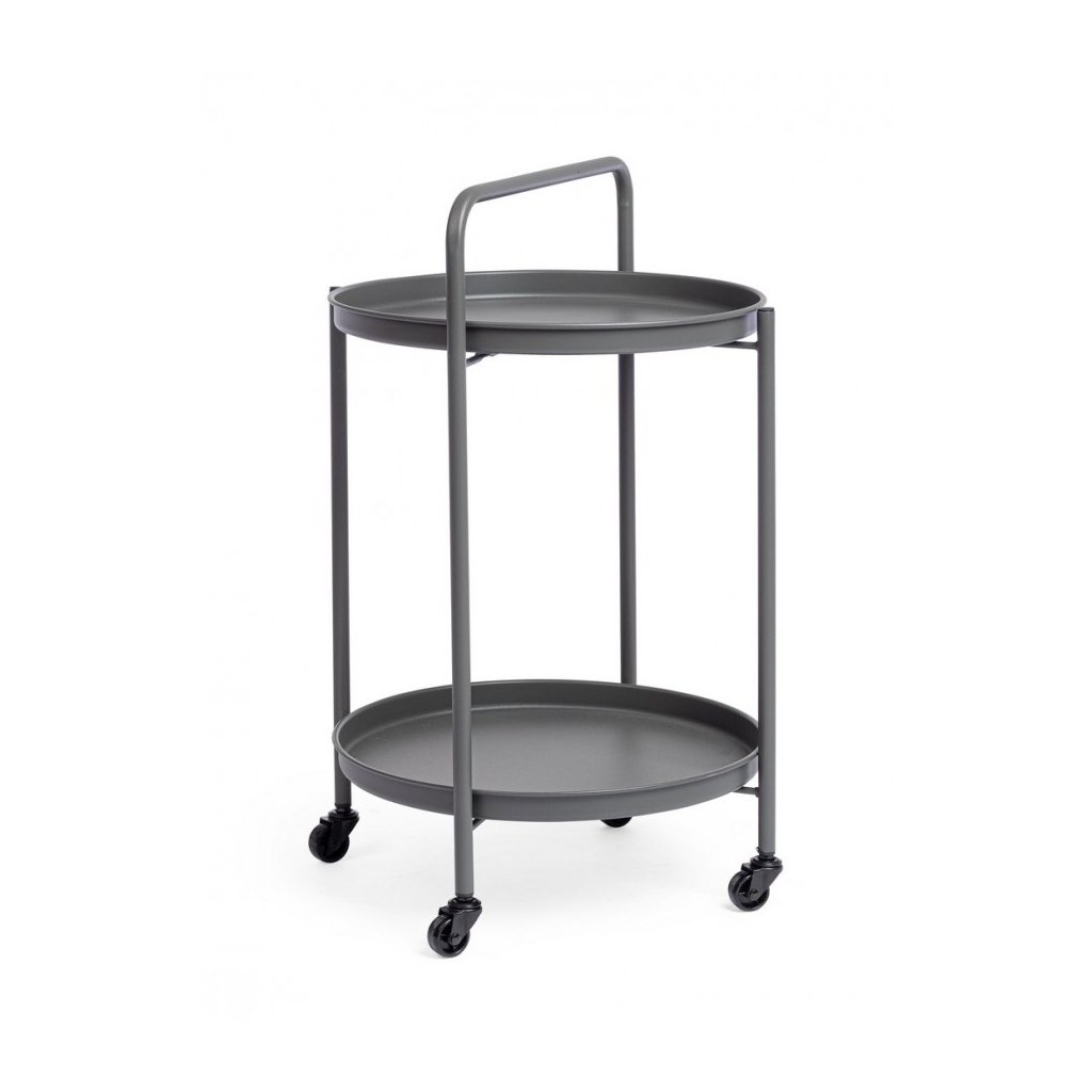 Zahradní vozík AUSTIN od italského výrobce stylového nábytku BIZZOTTO. Vozík AUSTIN je kompletně vyroben z oceli v antracitovém provedení. Povrch vozíku je upraven pro vnější použití s matným povrchem. Na nohou stolku jsou přidělaná 4 vyjímatelná kolečka. Vozík s průměrem 44,5 centimetrů má dvě odkládací plochy, které poskytují dostatek prostoru.