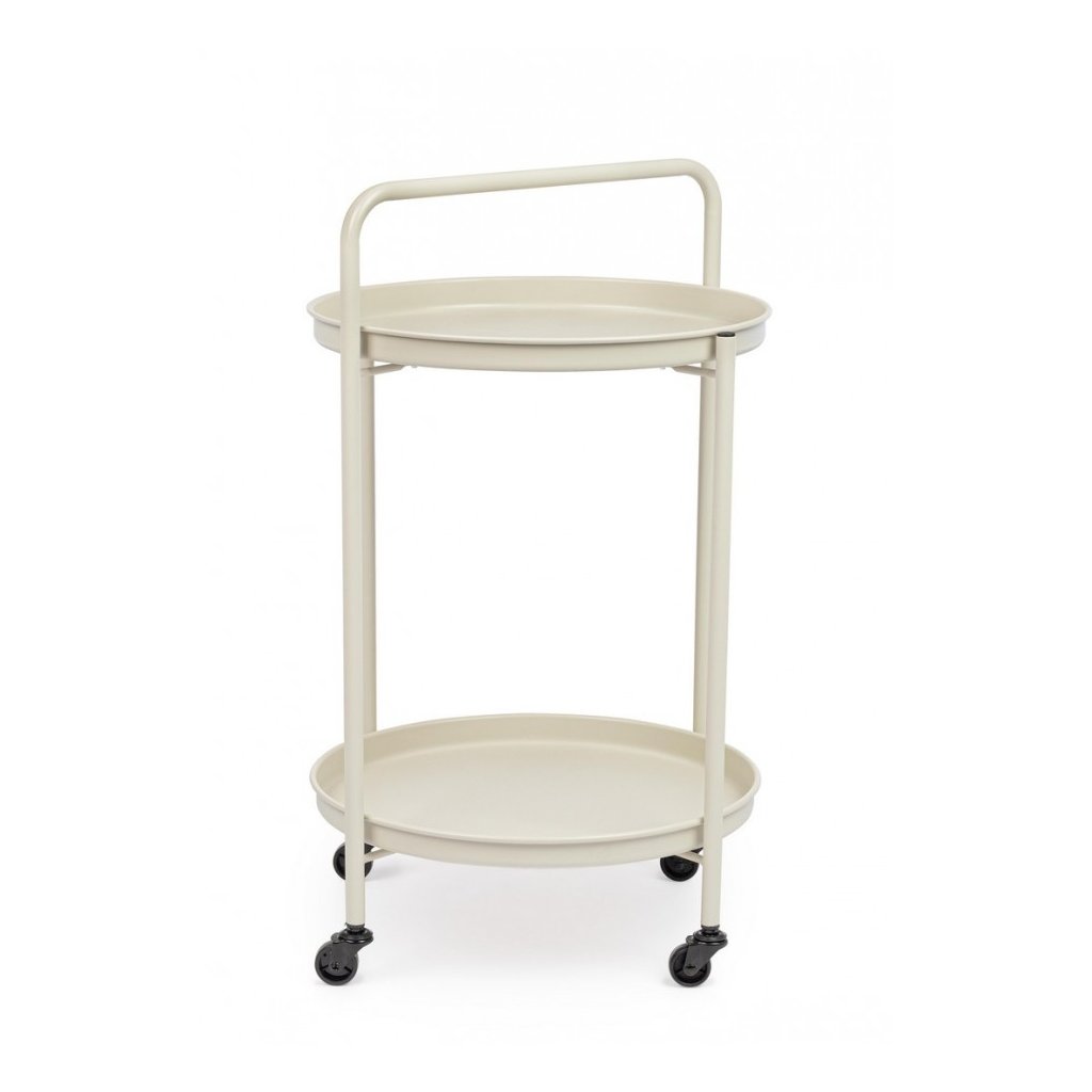 Zahradní vozík AUSTIN od italského výrobce stylového nábytku BIZZOTTO. Vozík AUSTIN je kompletně vyroben z oceli v krémovém provedení. Povrch vozíku je upraven pro vnější použití s matným povrchem. Na nohou stolku jsou přidělaná 4 vyjímatelná kolečka. Vozík s průměrem 44,5 centimetrů má dvě odkládací plochy, které poskytují dostatek prostoru.
