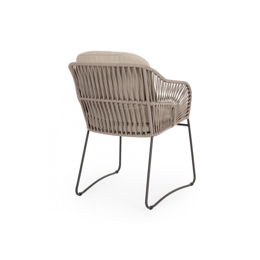 Designová venkovní židle CARLES od italského výrobce stylového nábytku BIZZOTTO. Židle je vyrobena z hliníkové konstrukce v černém odstínu přičemž sedák s područkami má vypletený z hnědé odolné tkaniny. Pro maximální pohodlí vám poslouží vyjímatelné polštáře z vodoodpuzující olefinové tkaniny.