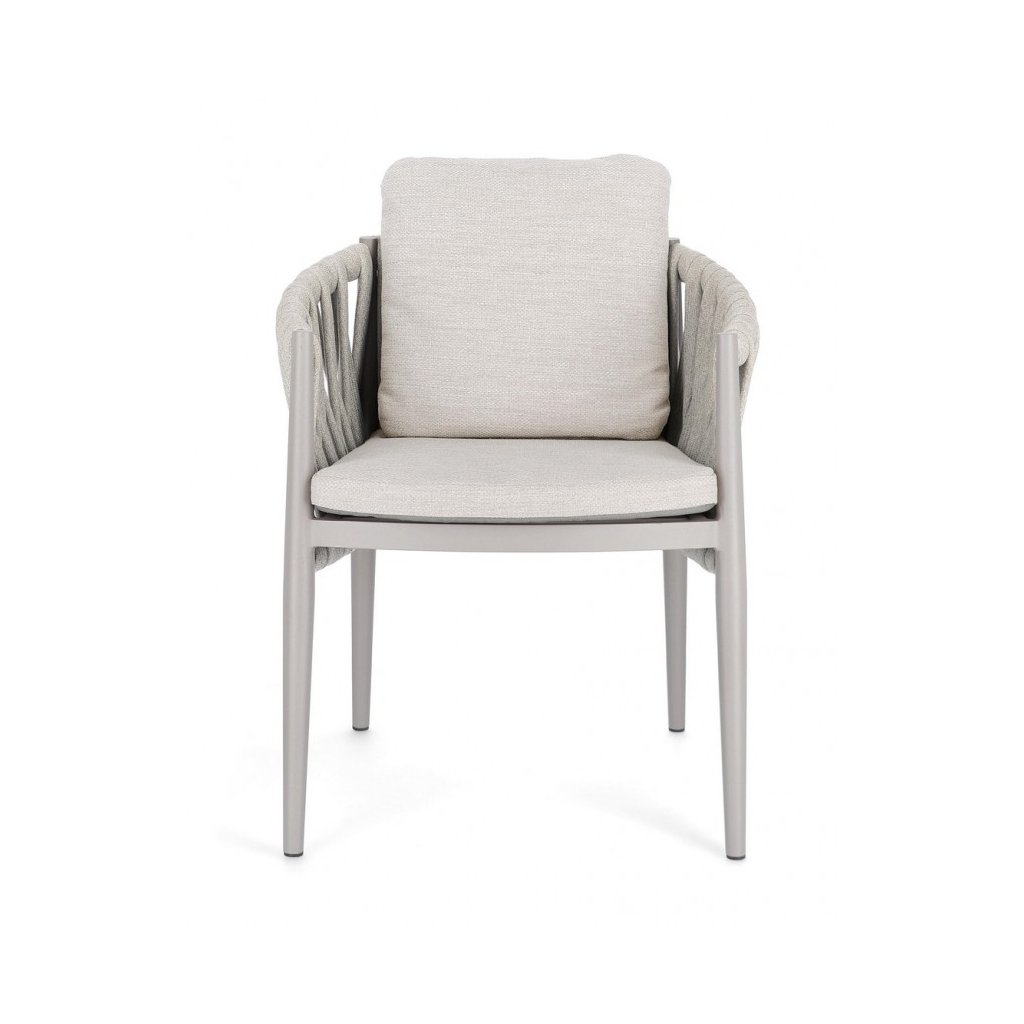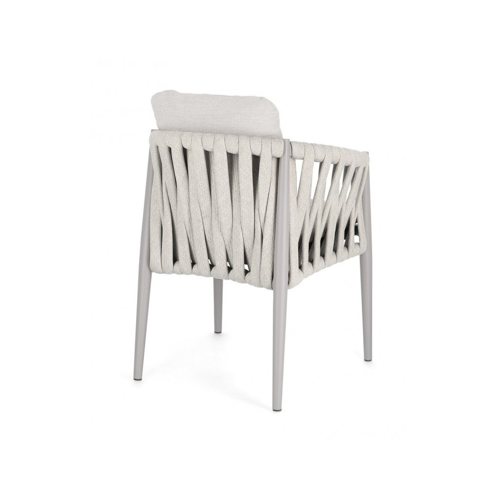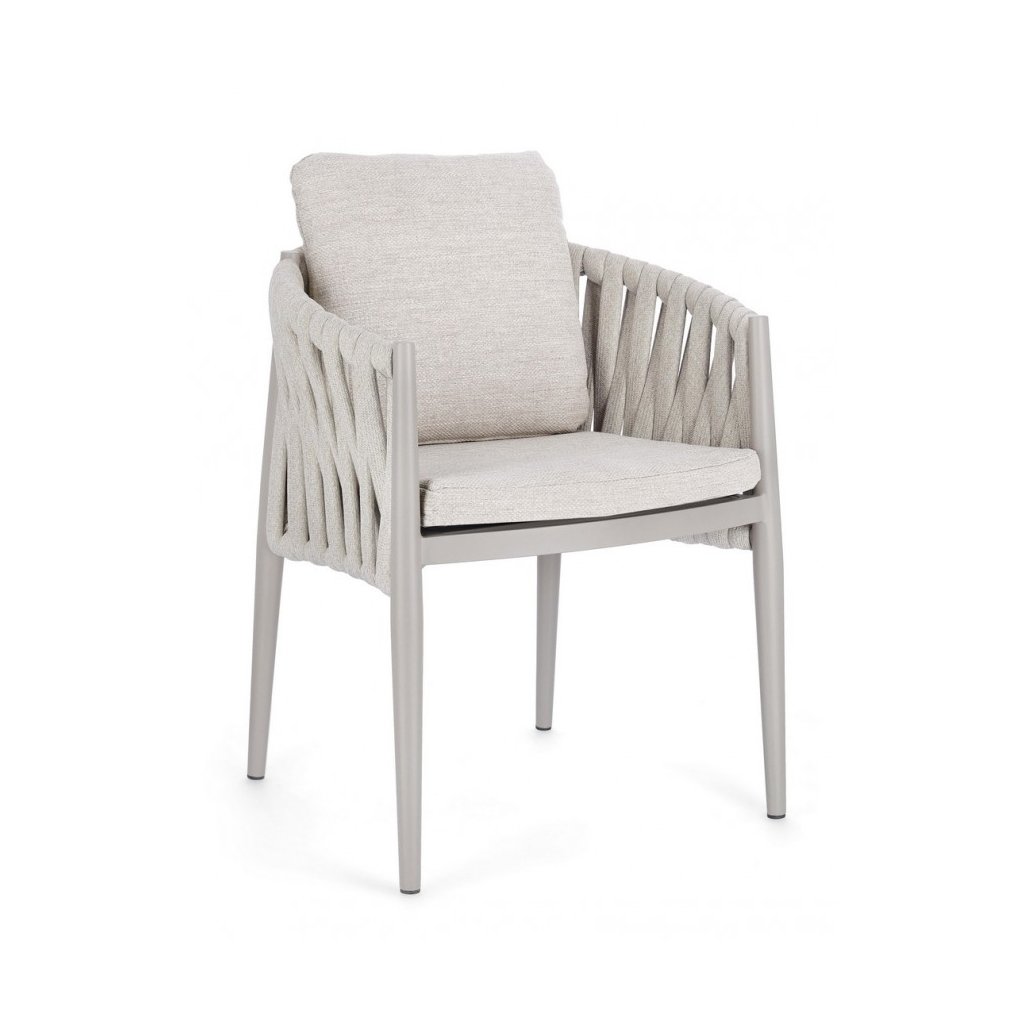 Designová  zahradní židle JACINTA od italského výrobce nádherného nábytku BIZZOTTO. JACINTA je dodávána s kvalitní kovovou konstrukcí. To dodává této židli maximální stabilitu a pevnost. Vrchní část židle tvoří sedák s opěrkou a područkami, které jsou obvázány polyesterovými lany v bílé barvě a dodávají tak originální design. Sedák a polštářek jsou potaženy polypropylenovou látkou, která je pohodlná a příjemná na dotek. Díky odolnému materiálu je možné využít jak uvnitř, tak i venku.