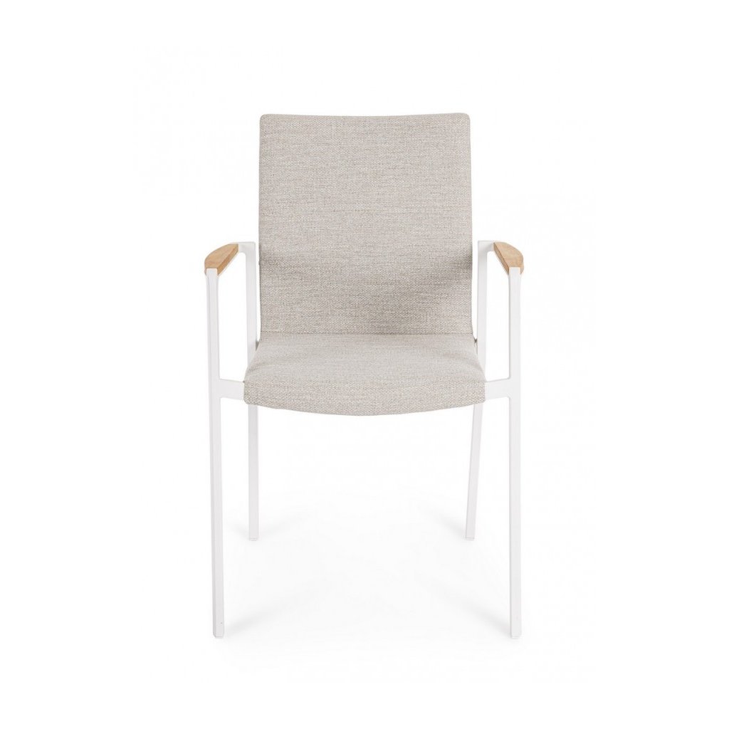 Stylová zahradní židle JALISCO od italského výrobce stylového nábytku BIZZOTTO. JALISCO je dodávána v moderním a krásném provedení bíle lakovaného hliníku, což z ní dělá lehkou, odolnou a stohovatelnou židli. Kostru tvoří 4 nohy, rám sedáku a opěrky a 2 područky s vloženými kusy teakového dřeva. Sedat a opírat se pak budete na nataženém plátnu z odolné látky a rychle schnoucí pěny. Židle je plně stohovatelná, takže ji můžete v klidu na zimu případně schovat. K dostání i v dalších variantách.
