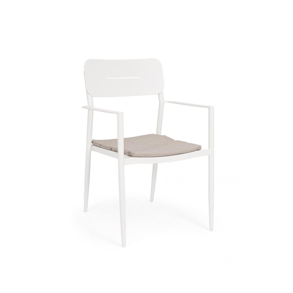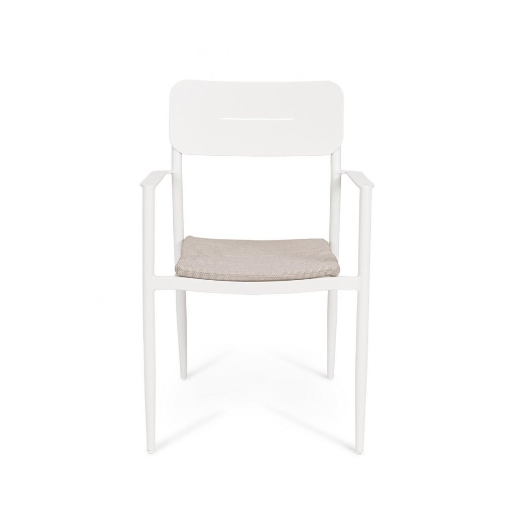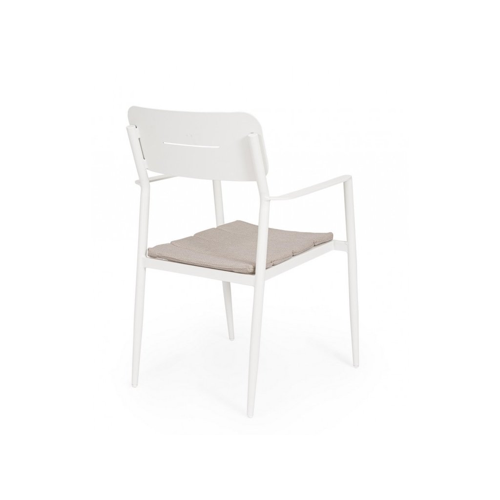 Designová zahradní židle NEBULA od italského výrobce stylového nábytku BIZZOTTO v kombinaci konstrukce v bílé barvě a béžového sedáku.