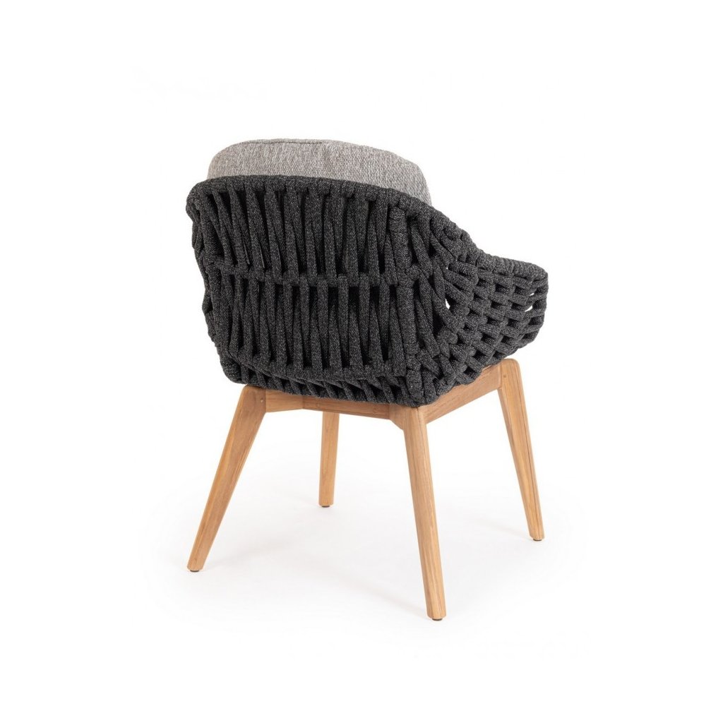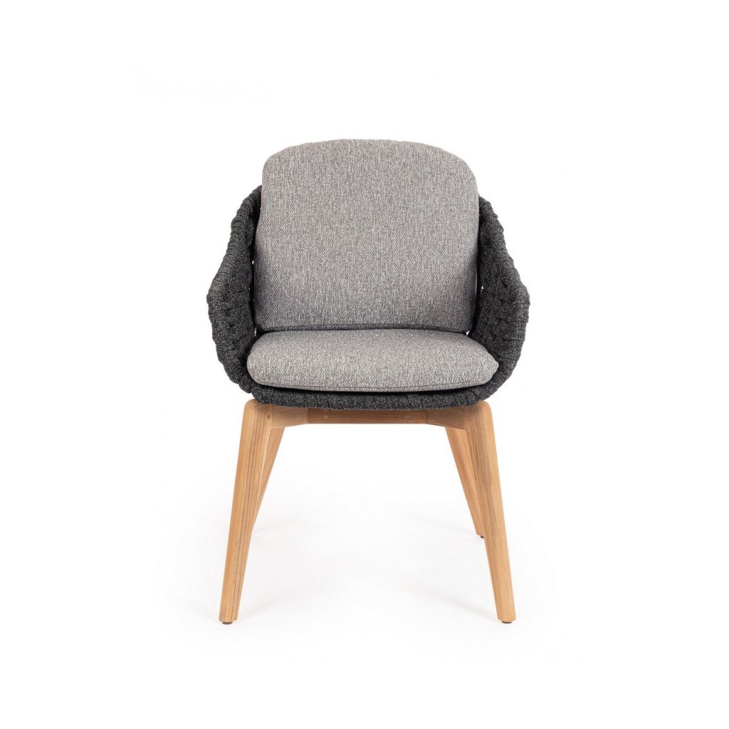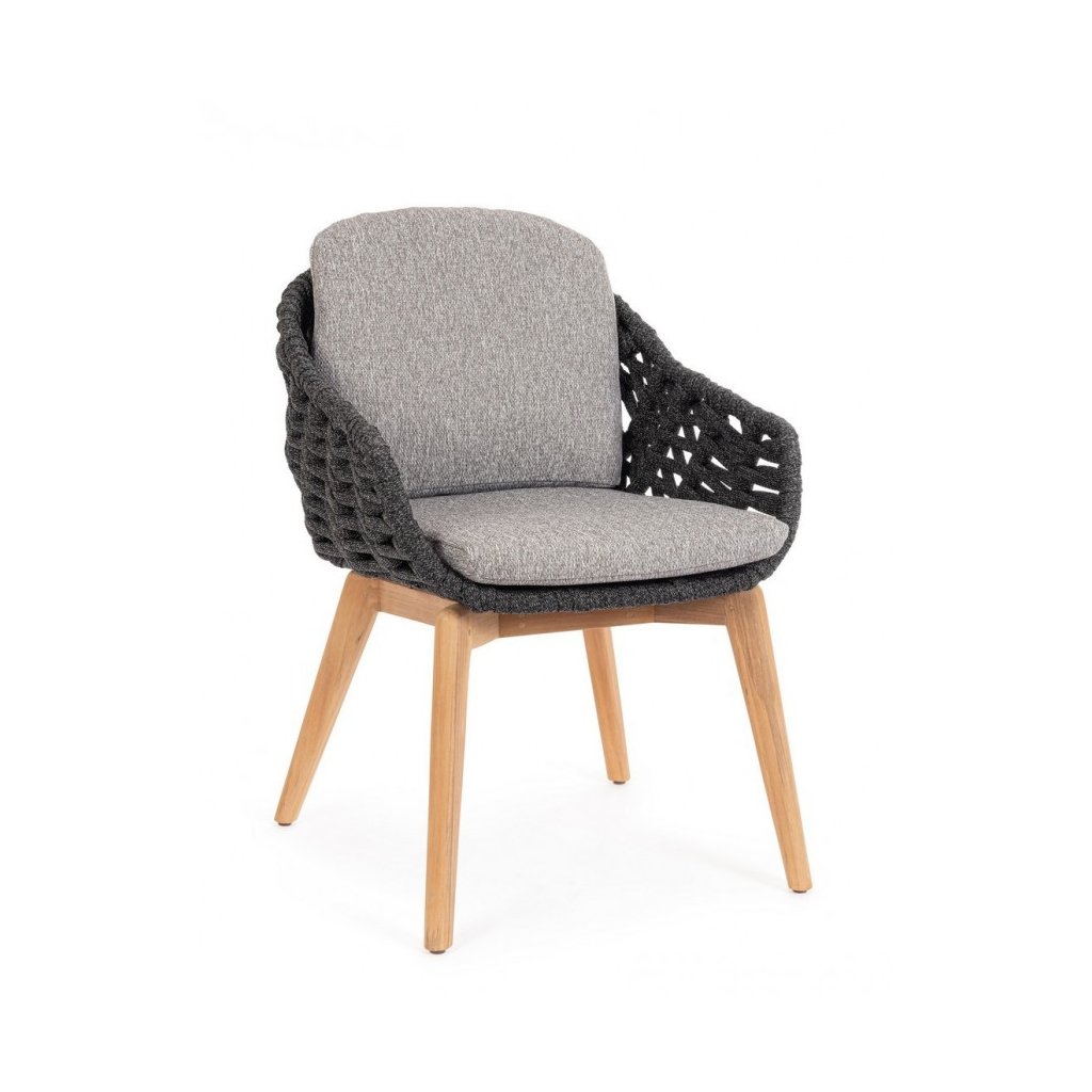 Zahradní židle TAMIRES od italské firmy stylového nábytku BIZZOTTO v provedení z hliníkového rámu, lana, teakového dřeva a olefinové látky v šedé barvě.