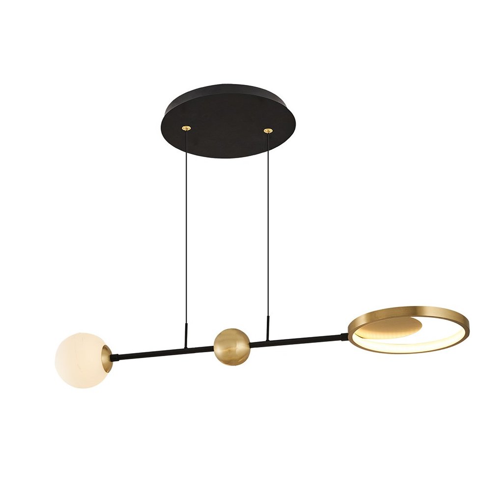 Stylové závěsné světlo ANTIQUE od výrobce designových světel OPVIQ. ANTIQUE tvoří vrchní kovová krytka pro zakrytí kabelů a uchycení do stropu, ze které vychází černé kabely. Na nich je kolmo připevněna samotná rozvodná černá kovová tyč. Uprostřed tyče je připevněna zlatá koule. Na stranách tyče jsou umístěna stínidla ve dvou různých provedeních. Vzájemně vytváří velmi nádherné osvětlení, které vám bude kdekdo závidět.