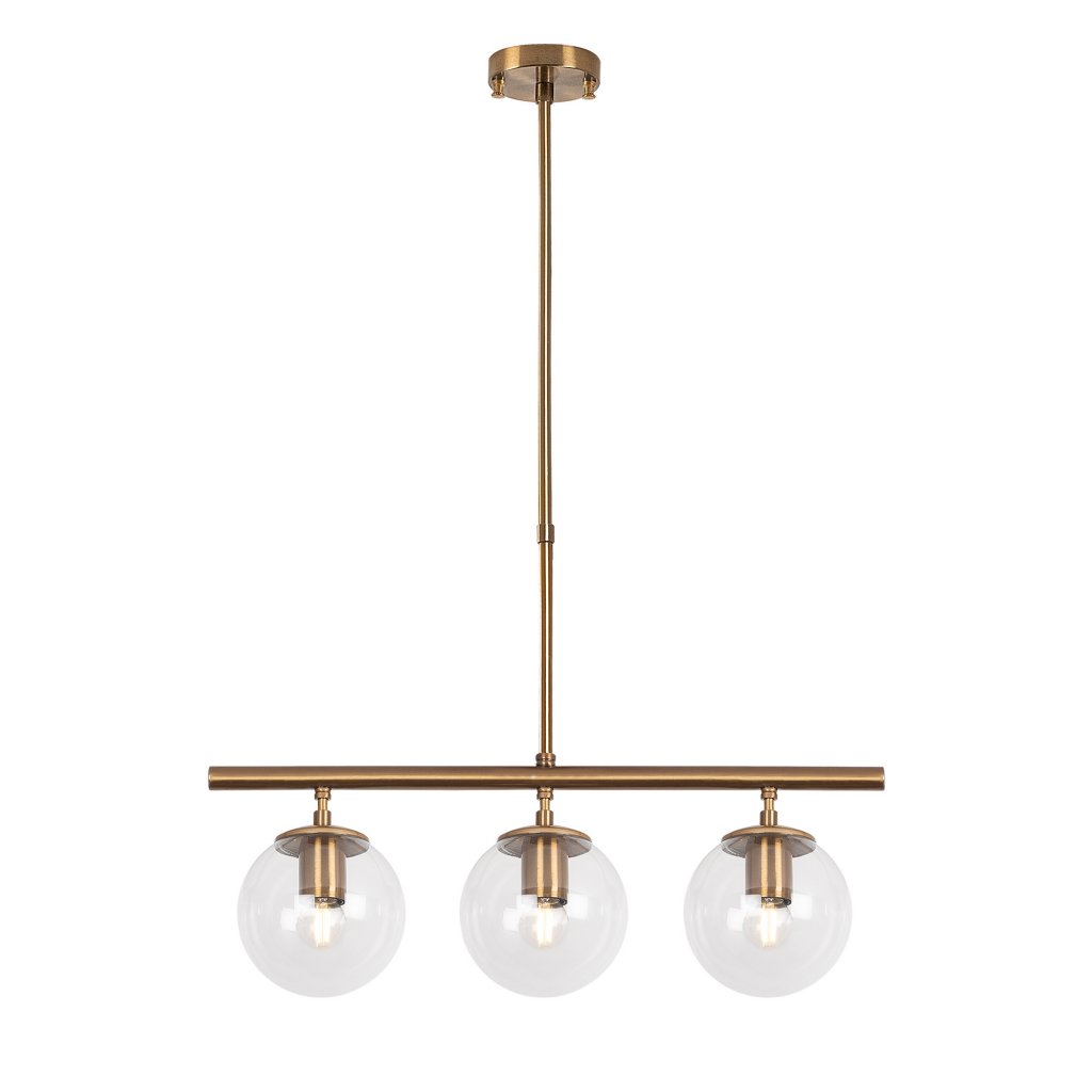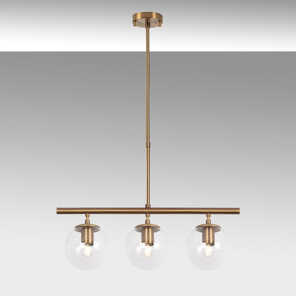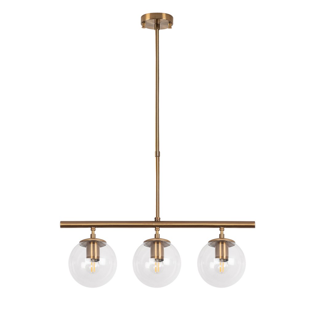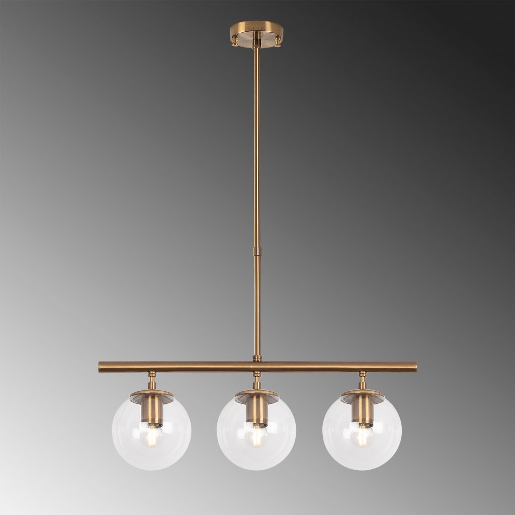 Stylové závěsné světlo ATMACA od výrobce designových světel OPVIQ. ATMACA tvoří vrchní kovová krytka pro zakrytí kabelů a uchycení do stropu, ze které vychází bronzová nastavitelná kovová tyč. Na ni je kolmo připevněna samotná rozvodná kovová tyč se 3 objímkami pro žárovky, které obklopují průhledné koule s průměrem 15cm. Koule jsou umístěny rovnoměrně po celé délce tyče. Vzájemně vytváří velmi zajímavé a vkusné osvětlení, které vám bude každý závidět.