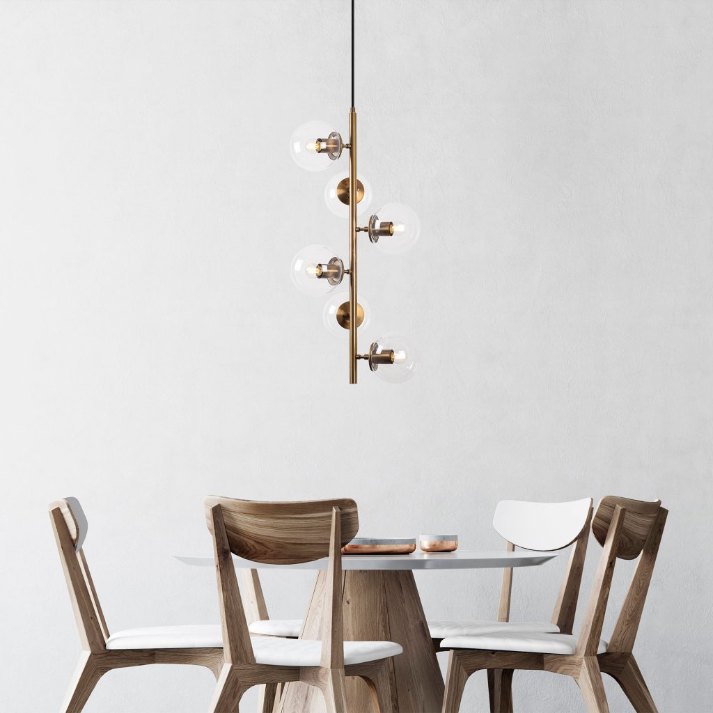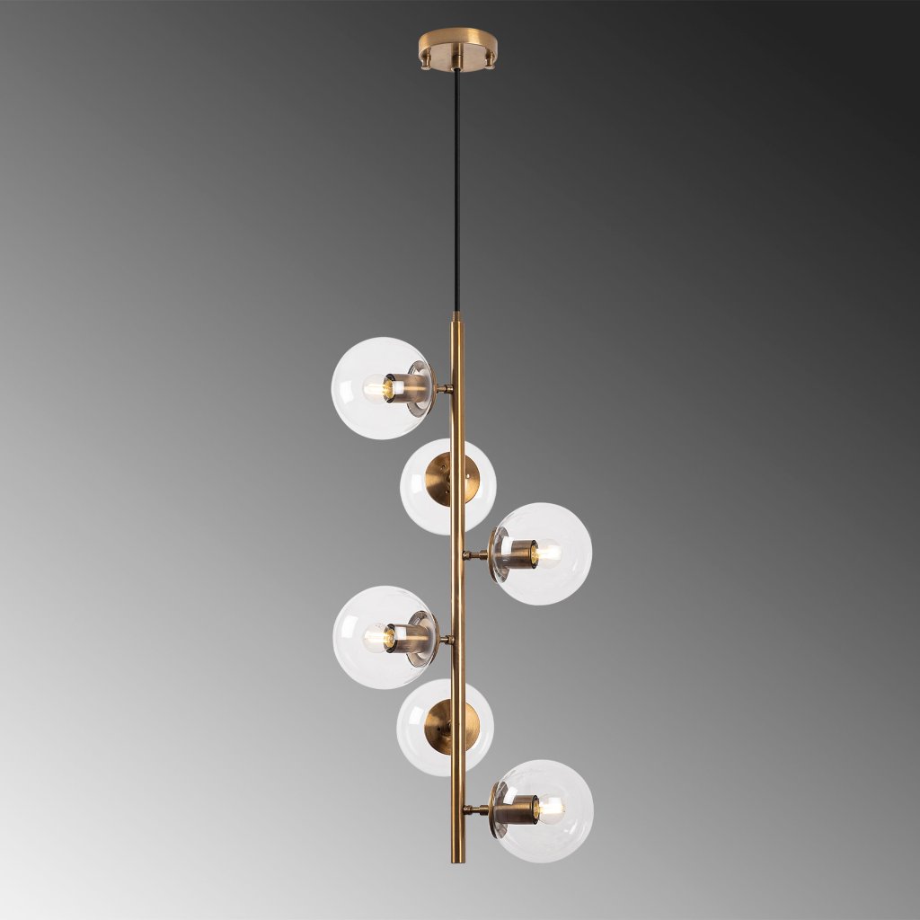 Stylové závěsné světlo FAZLI od výrobce designových světel OPVIQ. FAZLI tvoří vrchní kovová mosazná krytka pro zakrytí kabelů a uchycení do stropu, ze které vychází černý kabel s délkou až 30cm, který lze podle libosti zkrátit a tím nastavit výšku světla. Samotné svítidlo pak tvoří bronzová podlouhlá tyč, ze které vychází 6 bronzových objímek a nádherná stínidla z čirého skla. Vzájemně vytváří velmi nádherné osvětlení, které vám bude kdekdo závidět.