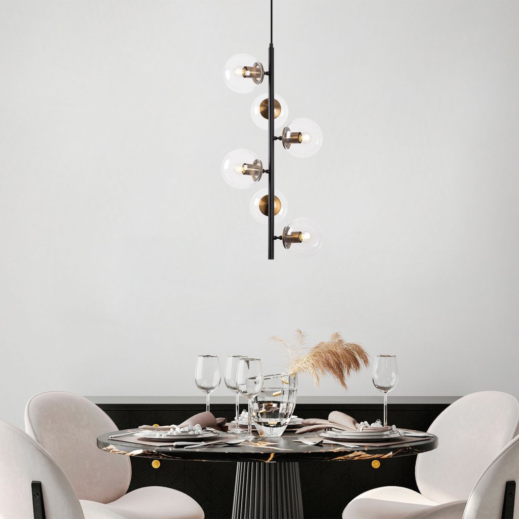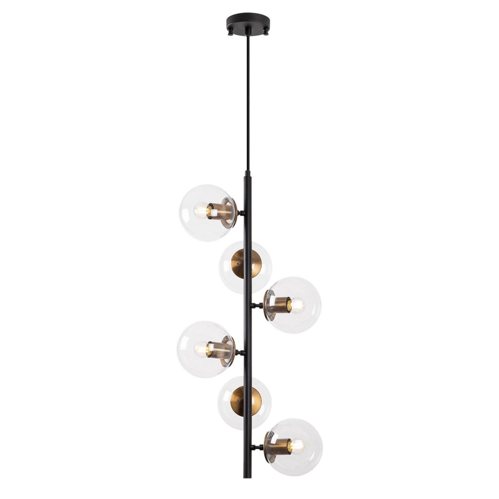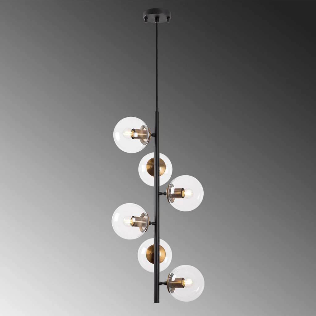 Stylové závěsné světlo FAZLI od výrobce designových světel OPVIQ. FAZLI tvoří vrchní kovová mosazná krytka pro zakrytí kabelů a uchycení do stropu, ze které vychází černý kabel s délkou až 30cm, který lze podle libosti zkrátit a tím nastavit výšku světla. Samotné svítidlo pak tvoří černá podlouhlá tyč, ze které vychází 6 bronzových objímek a nádherná stínidla z čirého skla. Vzájemně vytváří velmi nádherné osvětlení, které vám bude kdekdo závidět.