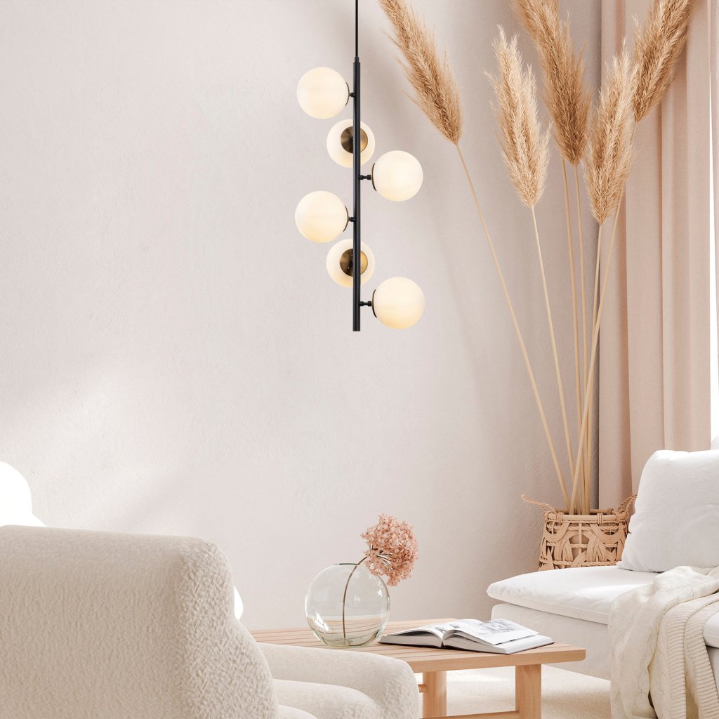 Stylové závěsné světlo FAZLI od výrobce designových světel OPVIQ. FAZLI tvoří vrchní kovová mosazná krytka pro zakrytí kabelů a uchycení do stropu, ze které vychází černý kabel s délkou až 30cm, který lze podle libosti zkrátit a tím nastavit výšku světla. Samotné svítidlo pak tvoří černá podlouhlá tyč, ze které vychází 6 bronzových objímek a nádherná stínidla z mléčného skla. Vzájemně vytváří velmi nádherné osvětlení, které vám bude kdekdo závidět.