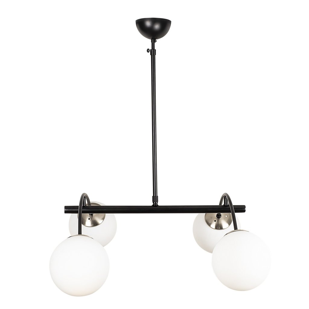 Designové závěsné osvětlení HILAL od výrobce stylových osvětlení OPVIQ. Je vyroben v kovovém provedení v černé barvě s bílými skleněnými stínidly. Velmi elegantní a v současnosti oblíbené svítidlo, moderní lustr, který se hodí do všech moderního i dalších prostor, díky své charismatické kombinaci kovu a 4 skleněných koulí.