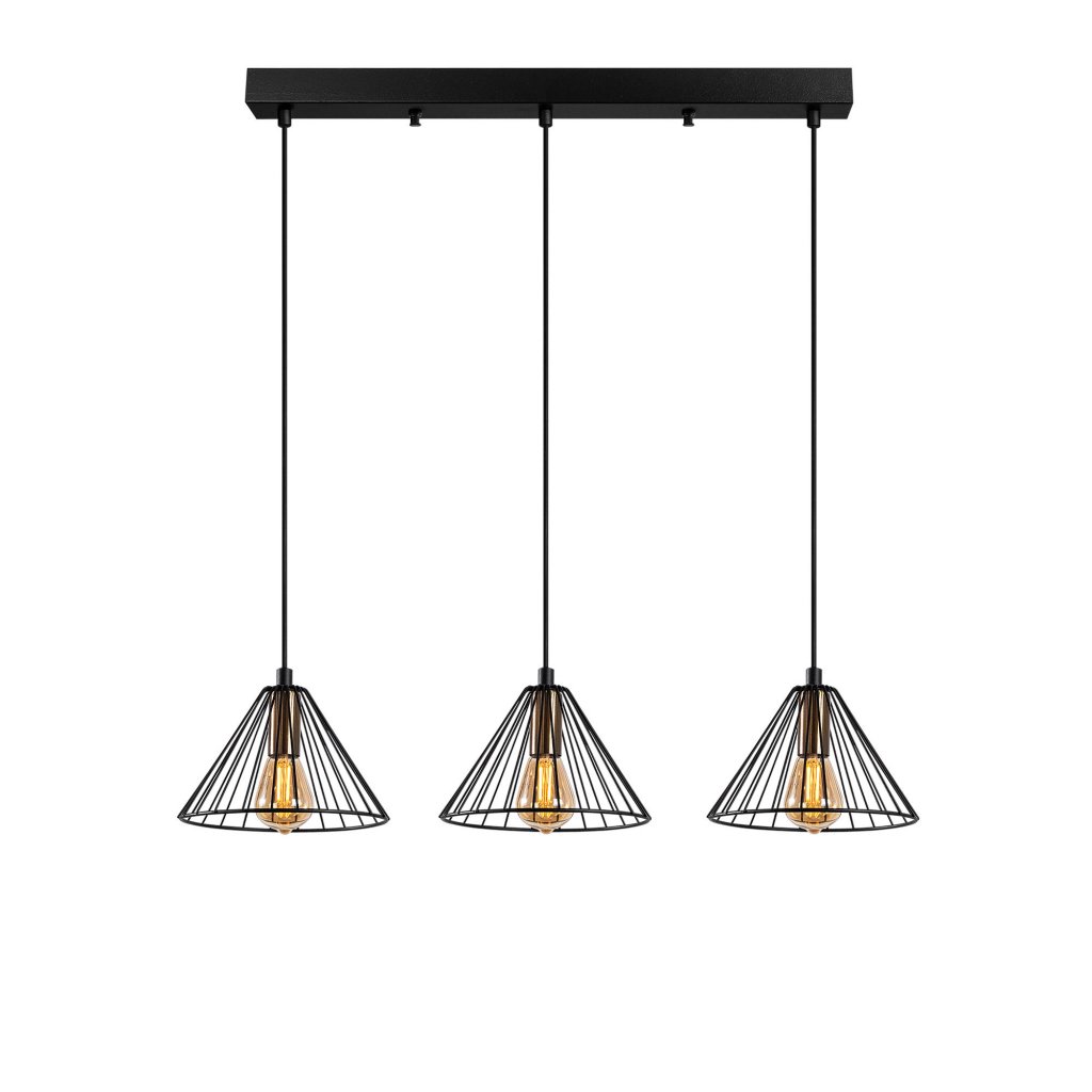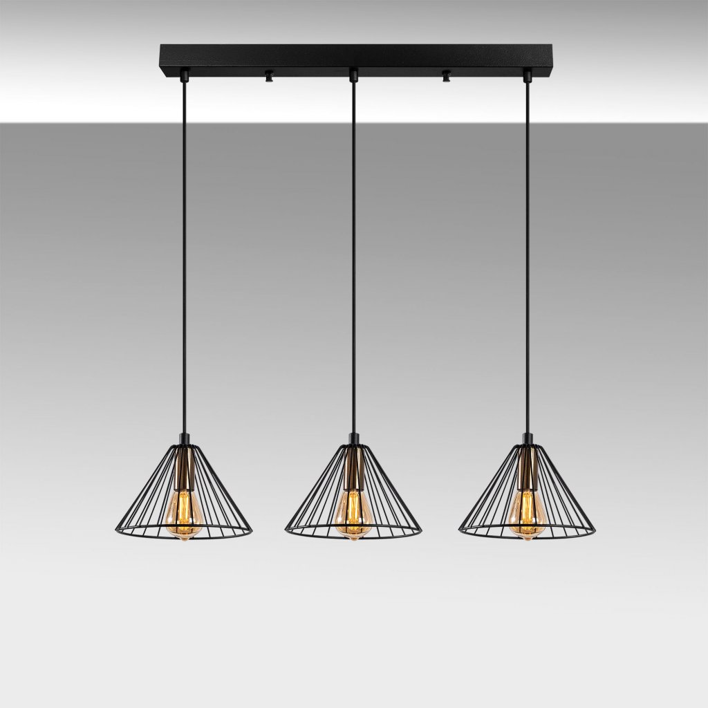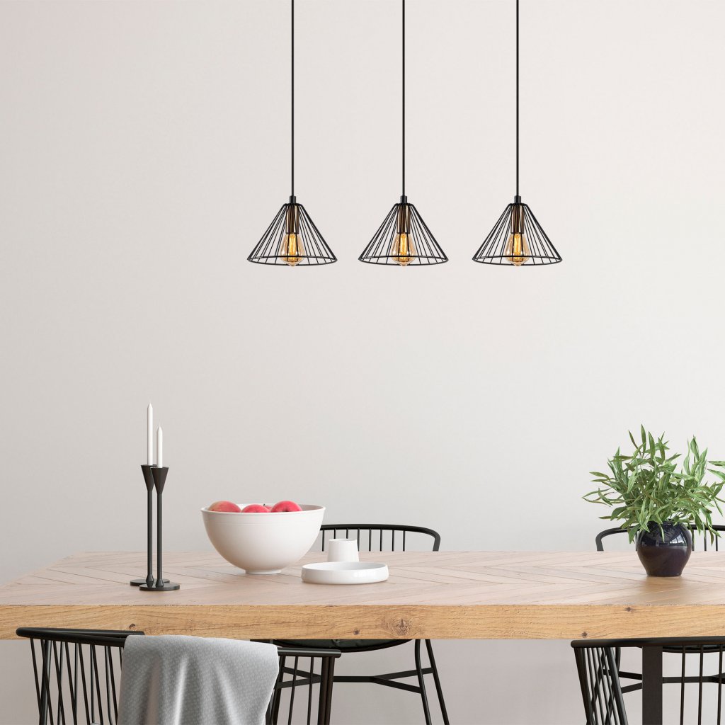Závěsné osvětlení SOYL od výrobce stylového osvětlení OPVIQ. Světlo tvoří vrchní kovová krytka dlouhá 72 cm, za kterou schováte elektrické kabely a závěsnou skobu. Z ní vychází 3 elektrické kabely do 3 jednotlivých světel celku. Vše ukončeno mosaznými objímkami a decentními kovovými stínidly z černě lakovaných tenkých tyček. Výšku jednotlivých světel můžete libovolně měnit podle kabelu.