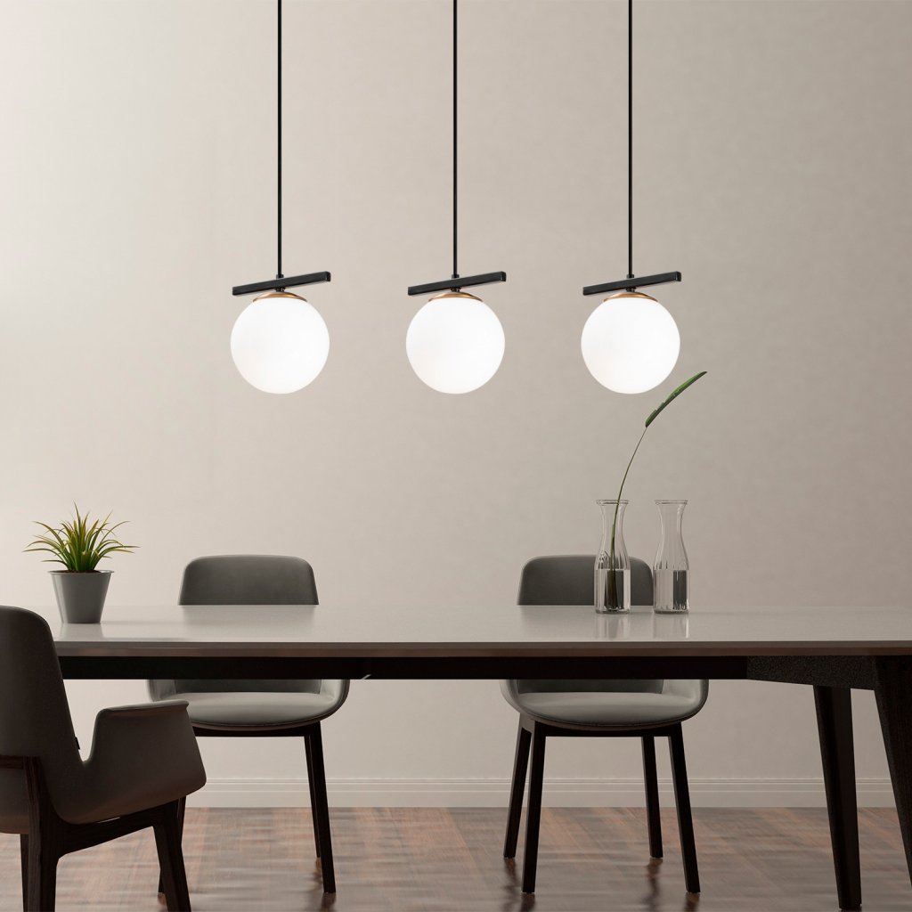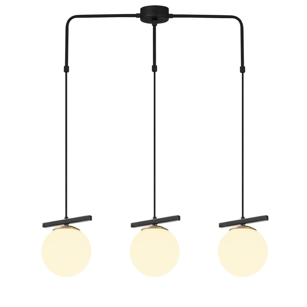 Designové závěsné osvětlení UZUM od kvalitního výrobce stylových osvětlení OPVIQ v černém provedení. Moderní a stylový lustr se třemi svítidly z bílého skla, mosaznými úchyty, základnou a závěsnými tyčemi v černé barvě.
