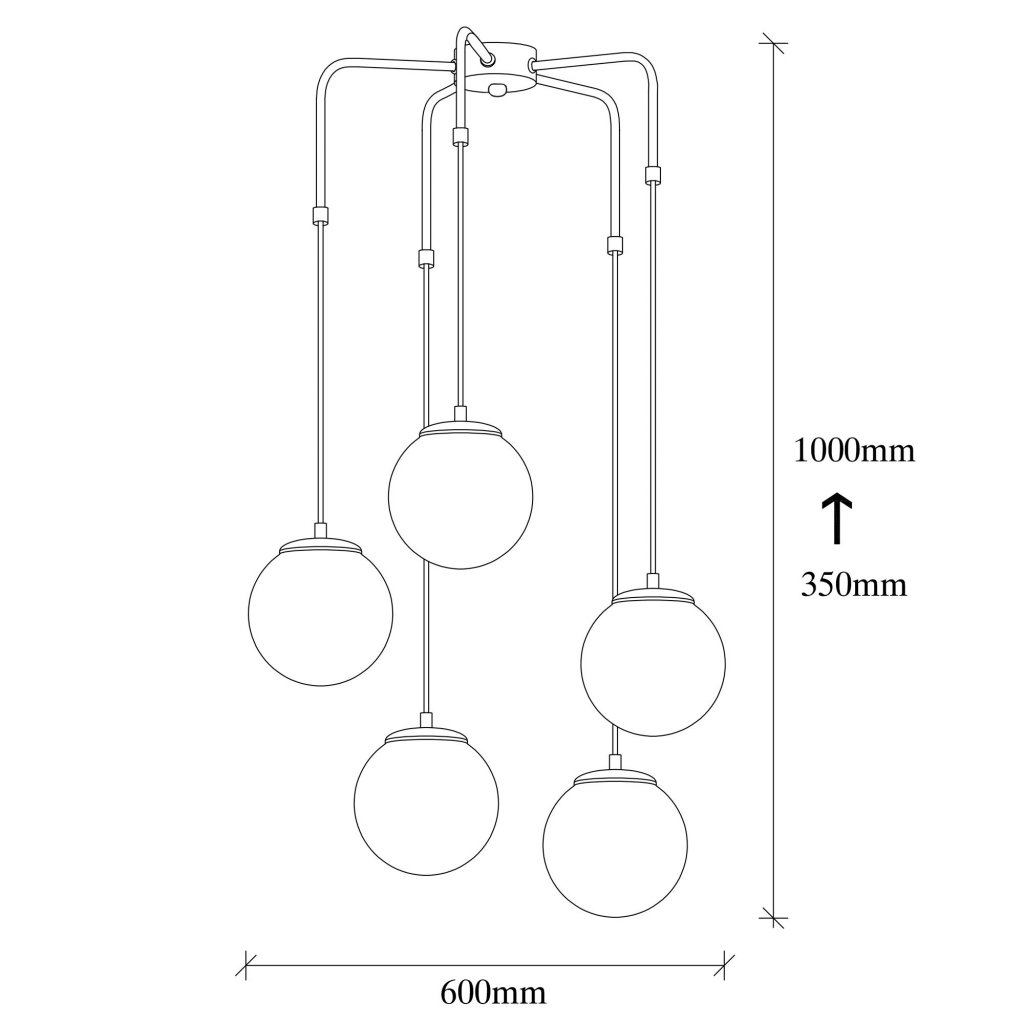 Designové závěsné osvětlení UZUM od výrobce stylových osvětlení OPVIQ v černém provedení. Moderní a stylový lustr s pěti svítidly z bílého skla, chromovanými úchyty, základnou a závěsnými tyčemi v černém provedení.