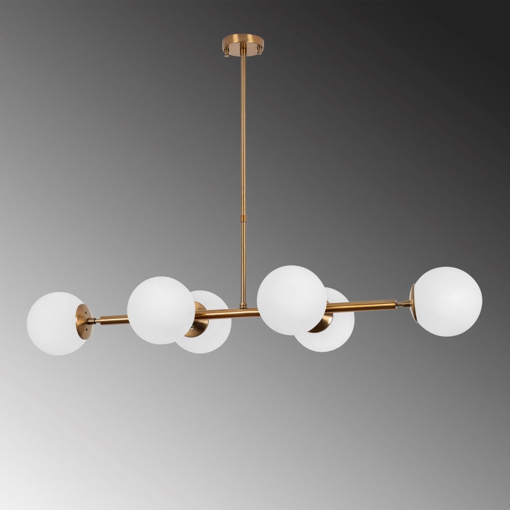 Stylová závěsné světlo FAZ od výrobce designových světel OPVIQ. FAZ tvoří vrchní kovová krytka pro zakrytí kabelů a uchycení do stropu, ze které vychází mosazná kovová tyč, jejíž velikost si můžete nastavit od 35cm do 66cm. Na ni je kolmo připevněna samotná rozvodná mosazná kovová tyč se 6 objímkami pro žárovky a koulemi z mléčného skla. Koule jsou umístěny 2 a 2 po jednotlivých stranách a 1 a 1 na konci této tyče. Vzájemně vytváří velmi nádherné osvětlení, které vám bude kdekdo závidět.