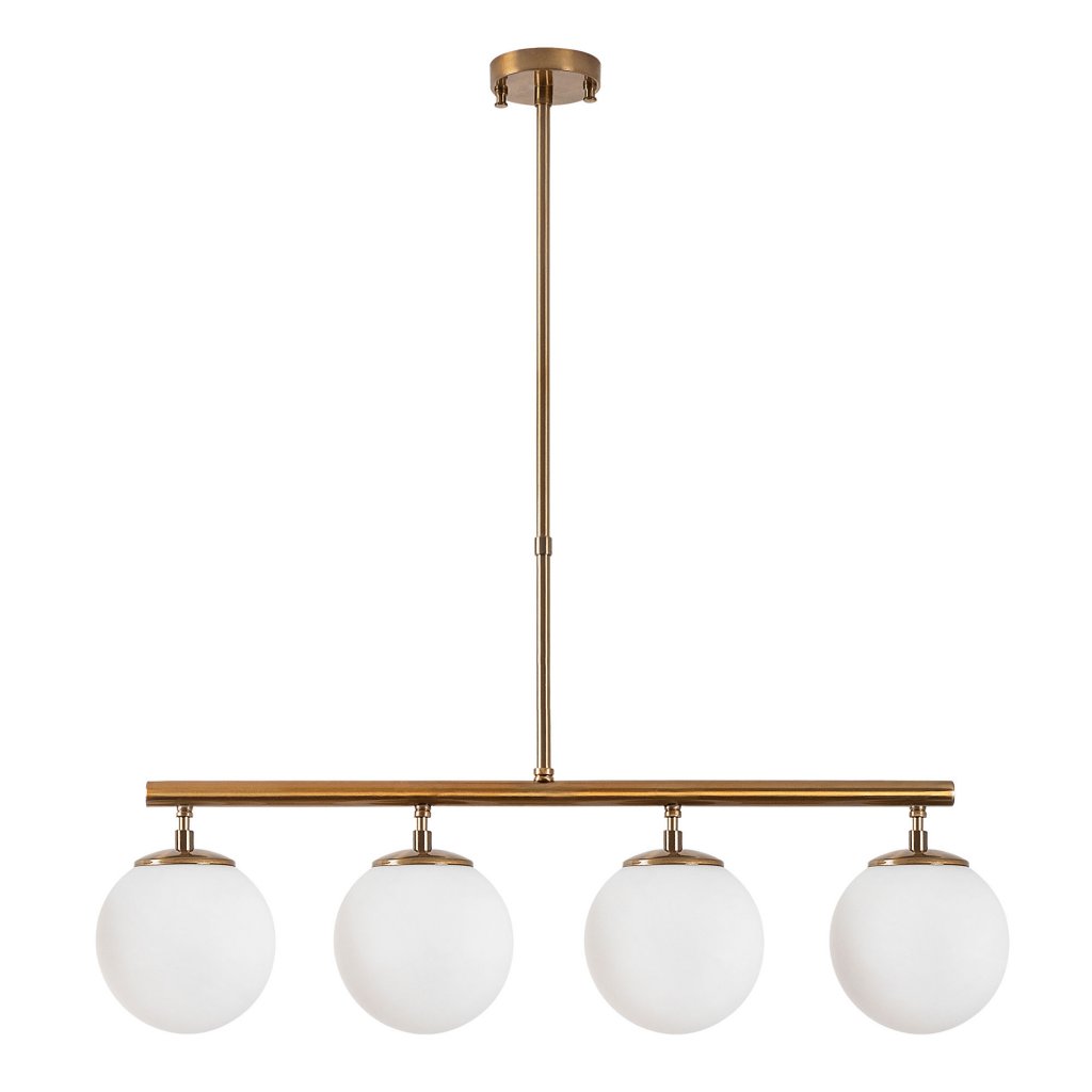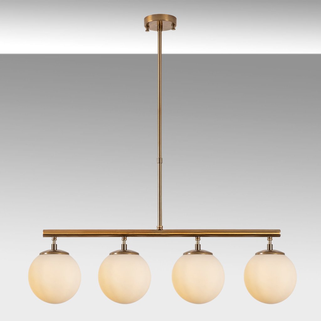 Nádherné závěsné osvětlení FAZLI od výrobce stylového osvětlení OPVIQ. Svítidlo tvoří vrchní kovová krytka, ukrývající uchycení a elektrické kabely, která přechází v tenkou kovovou, nastavitelnou centrální tyč postupující dolů. Na konci je kolmo přichyceno samo tělo světla, které nese čtyři objímky pro žárovky a koule z mléčně bílého skla. Vše vyrobeno v kovovém provedení s bronzovou barvou.