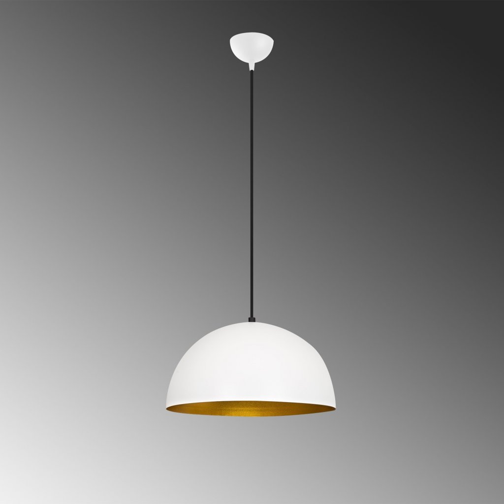 Designové závěsné světlo SIVANI od výrobce osvětlení OPVIQ. Krásné bílé kovové stínidlo ve tvaru polokoule, jehož vnitřní strana je vybarvena do barvy zlaté mosazi, jistě vynikne nejen v pracovně či jídelně. Vnější část kovového stínila má bílou barvu. Světlo je výškově nastavitelné.