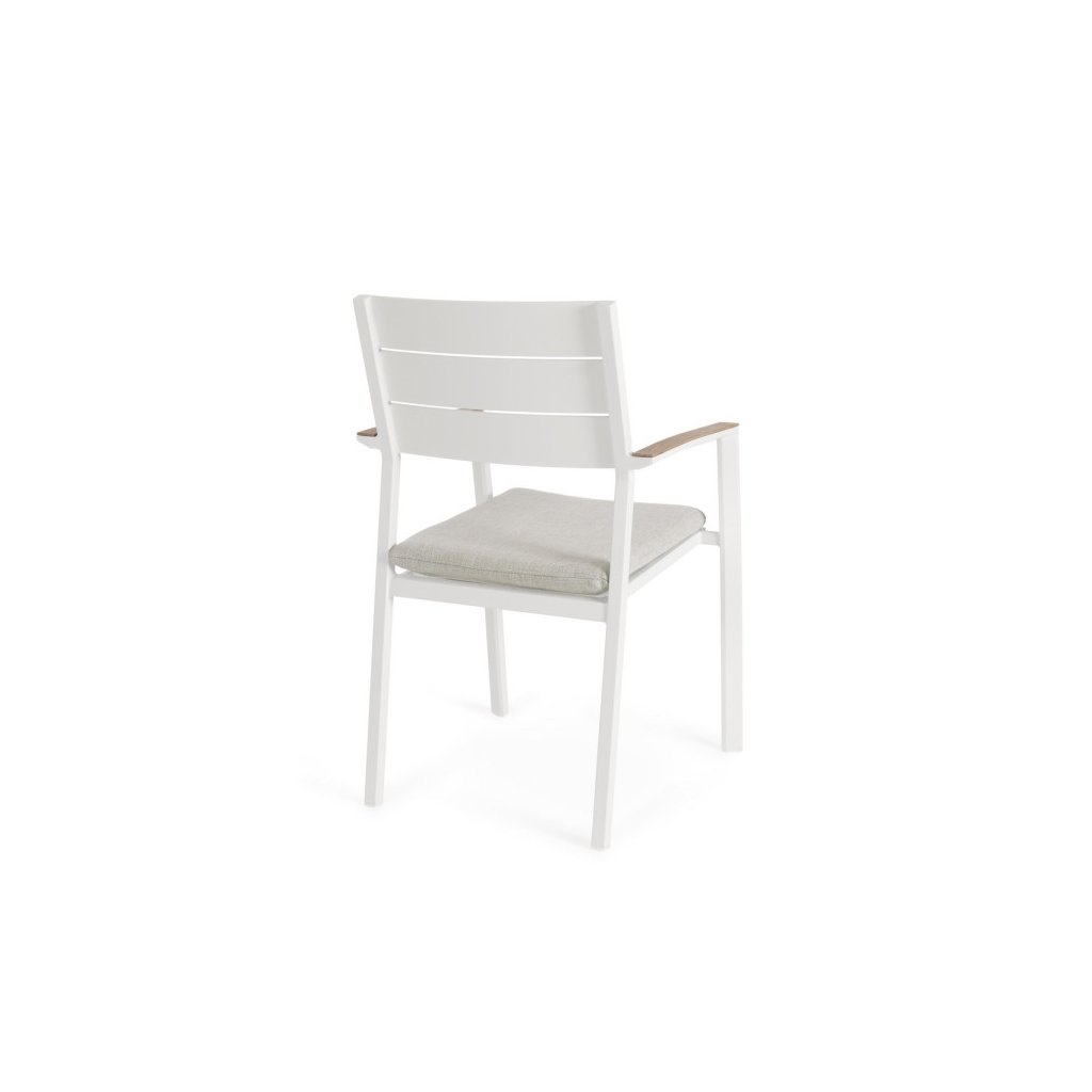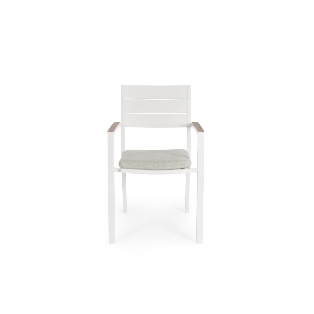 Stylová zahradní židle ZELMAR od italského výrobce stylového nábytku BIZZOTTO. Židle ZELMAR má nádhernou konstrukci včetně 2 područek a opěrky z velmi světle šedě lakovaného hliníku, což zajišťuje jeho stabilitu a odolnost proti povětrnostním podmínkám, ale také nízkou váhu a jednoduchou manipulovatelnost. Židličku doplňuje polštářek na sezení pro lepší comfort z voděodolného olepenu, který je odnímatelný. Židle je plně stohovatelná, takže při zimním úklidu nezabere tolik místa.