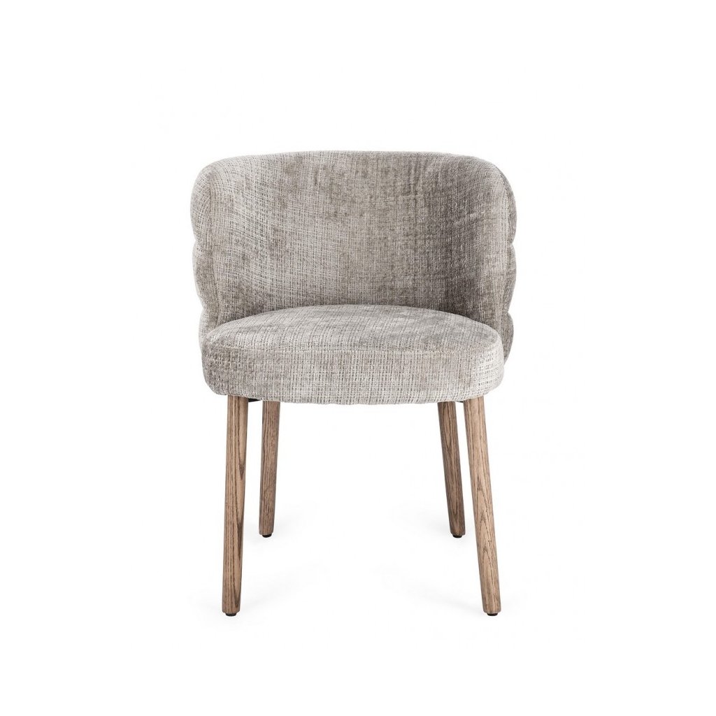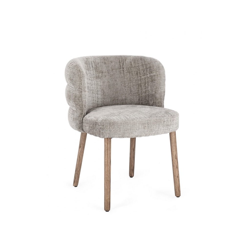 Designová jídelní židle ILMA od italského výrobce stylového nábytku BIZZOTTO. Židle ILMA má 4 nohy z masivního dubového dřeva v hnědé barvě. Na to navazuje konstrukce, která kombinuje kov, překližku, pěnu a krásný potah v šedé barvě.  Zejména zadní část židle se 3 vlnkami je originálním prvkem židle, díky čemuž je velmi nádherná.