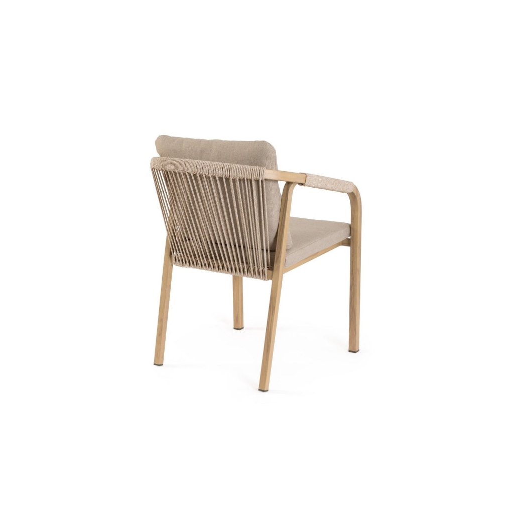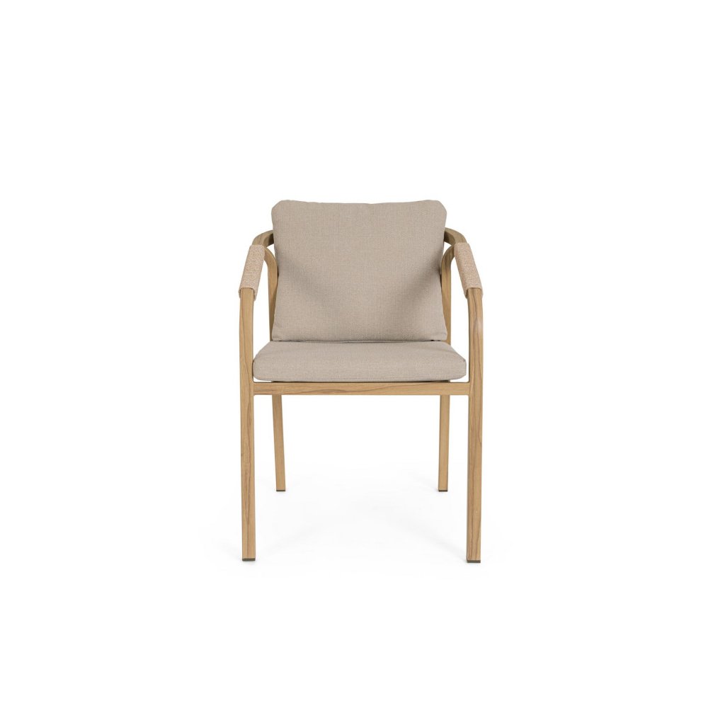 Designová venkovní židle KALIMERA od italského výrobce stylového nábytku BIZZOTTO. Židle je kompletně vyrobena z hliníku v provedení teple hnědé imitace dřeva pro zajištění maximální trvanlivosti dřeva ve venkovních podmínkách. Židli tvoří rám, který začíná na 4 nohou, které přechází v područky a pokračuje do vrchní části židle, opěrky. Sedák a opěrka jsou tvořeny z polštářků z voděodolné látky OLEFIN v šedé barvě.