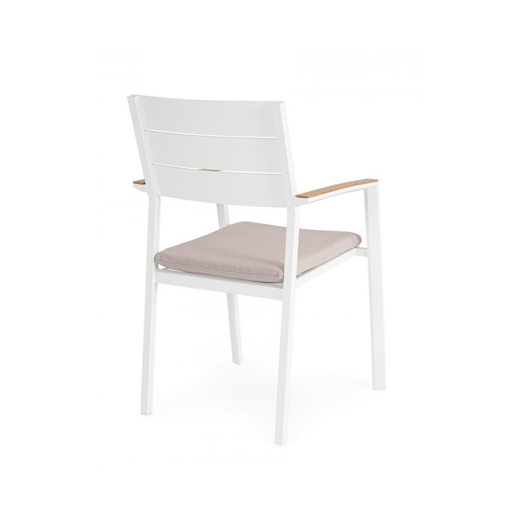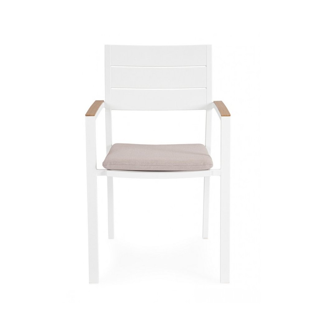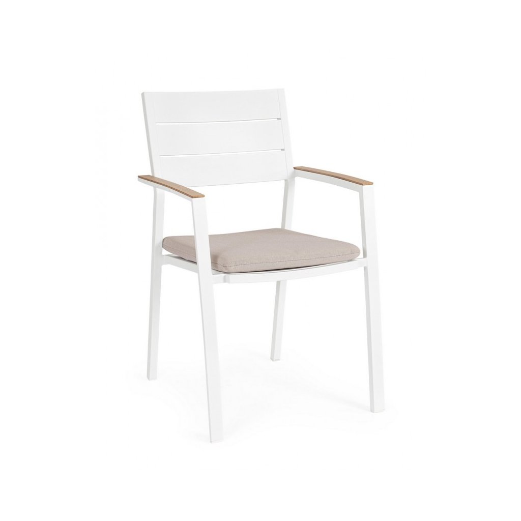 Stylová zahradní židle ZELMAR od italského výrobce stylového nábytku BIZZOTTO. Židle ZELMAR má nádhernou konstrukci včetně 2 područek a opěrky z bíle lakovaného hliníku, což zajišťuje jeho stabilitu a odolnost proti povětrnostním podmínkám, ale také nízkou váhu a jednoduchou manipulovatelnost. Židličku doplňuje polštářek na sezení pro lepší comfort z voděodolného olepenu, který je odnímatelný. Židle je plně stohovatelná, takže při zimním úklidu nezabere tolik místa.