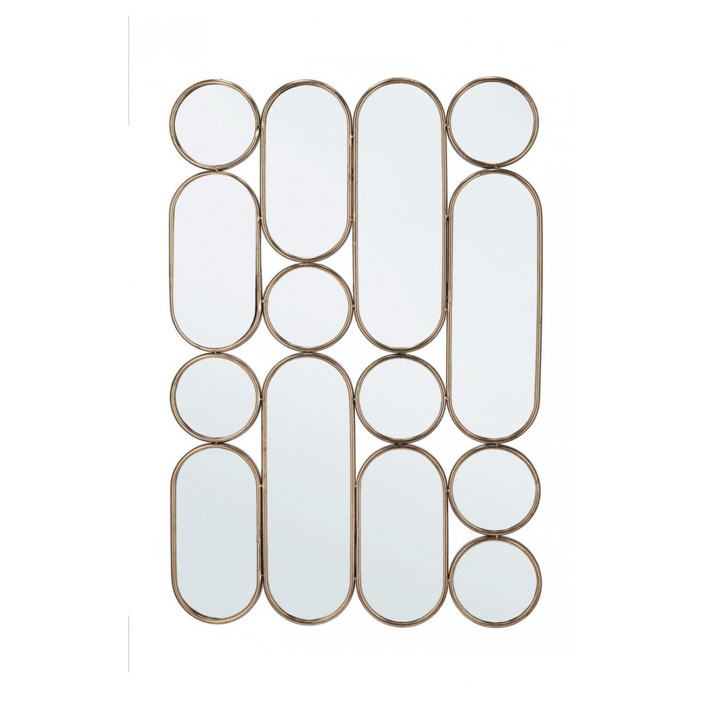 Designové zrcadlo HANIMA od italského dodavatele stylového nábytku BIZZOTTO. Rám zrcadla HANIMA je vyroben z kovu ve zlatém provedení. Zrcadlo je vyrobeno ručně, a proto má každé svůj jedinečný vzhled. Zajímavý tvar tvořící několik kruhů a oválů. Velice elegantní zrcadlo, které si opravdu zamilujete. Hodí se do tmavých i světlých interiérů.